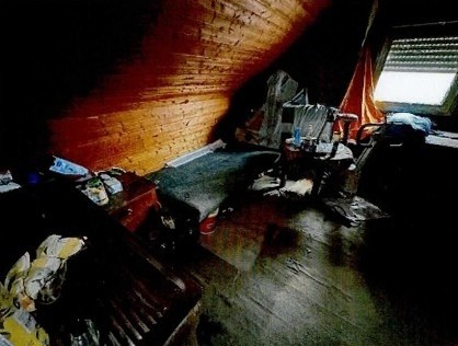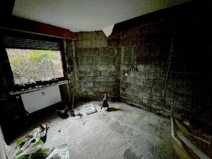 Der Haupteingang zur EG-Wohnung ist nicht zugänglich. Der Zugang zur Erdgeschosswohnung ist über den Nebeneingang der Mieter im OG möglich. Das Erdgeschoss ist nicht bewohnbar. Ein Fäkalschaden ist im Jahr 2022 aufgetreten. In zwei Räumen ist die Geschossdecke zum Keller provisorisch durch durchnässte Trockenbauplatten verschlossen. Diese drohen durchzubrechen. Teilbereiche sind in den Rohbauzustand zurückversetzt. Teilweise dringt Wasser über die Dachflächen ein. Pfützenbildung ist feststellbar. Teilweise besteht Einsturzgefahr. Derzeit ist eine der Wohnungen noch vermietet. In diesem Zusammenhang wurde eine Räumungsklage erfolgreich abgeschlossen. Dem Mieter wurde aufgegeben, die Wohnung bis Ende Januar 2026 zu räumen. Aktuell hat der Mieter nachgewiesen, dass er sich aktiv auf Wohnungssuche befindet, bislang jedoch noch keine geeignete Unterkunft gefunden hat. Die Wohnung im OG wird vom Mieter aktuell mit einem Wohnzimmerofen mit Holz beheizt. Die Zentralheizung ist außer Betrieb und nicht zu reparieren. Die Elektroleitungen liegen teilweise auf Putz, die Absicherungen und Verteilerkästen der Elektroversorgung sind teilweise defekt. Das Dachgeschoss ist über eine nicht genehmigte Außenwendeltreppe aus Stahl zugänglich. Die Verankerung der Treppe ist nicht sachgemäß, das Konstrukt wackelt. Das Dachgeschoss ist unbewohnbar. Teilbereiche im DG sind durch eine verklebte Tür abgeschlossen. Die Räume im DG sind vermüllt, die Elektroversorgung in diesem Bereich ist nicht mehr in Takt. Ob Wasser und Strom noch funktionsfähig sind, ist nicht bekannt. Der Keller ist nur eingeschränkt zugänglich, die Räume sind mit Gerümpel vollgestellt.