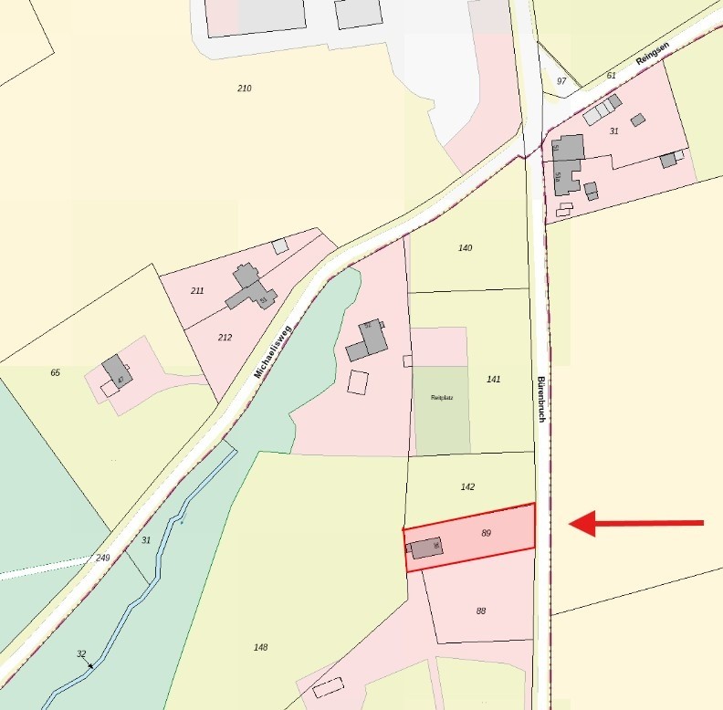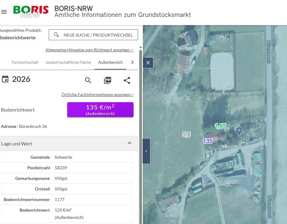 In den Fokus rückt das Grundstück mit seinen Möglichkeiten. In der Nachbarschaft befindet sich Landwirtschaft mit Silage-Anlagen. Der Bodenrichtwert beträgt in dieser Lage nach BORIS 2026 z. B. 135,00 Euro/qm für Außenbereich und 5,60 Euro/qm für Landwirtschaftsfläche.