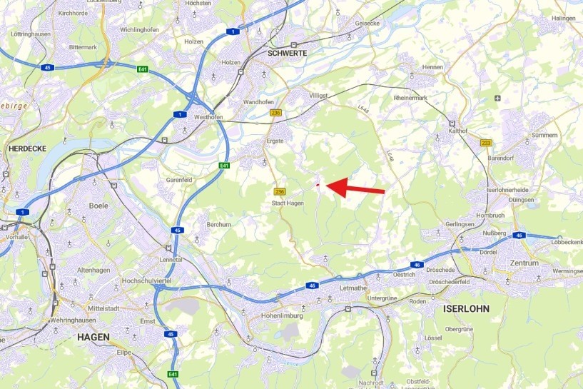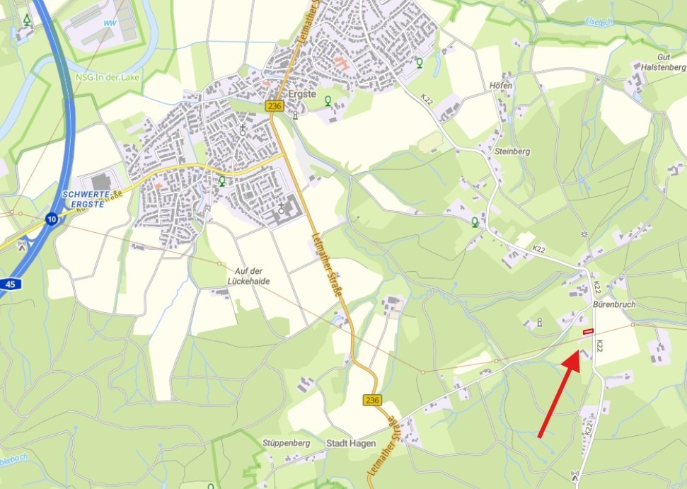 Das Flurstück befindet sich in recht zentraler, ländlicher Lage bei Ergste-Bürenbruch, mittig im Städtedreieck Hagen – Schwerte – Iserlohn. Die Luftlinie zu den genannten Städten beträgt jeweils nur zwischen 5 und 8 Kilometer.
