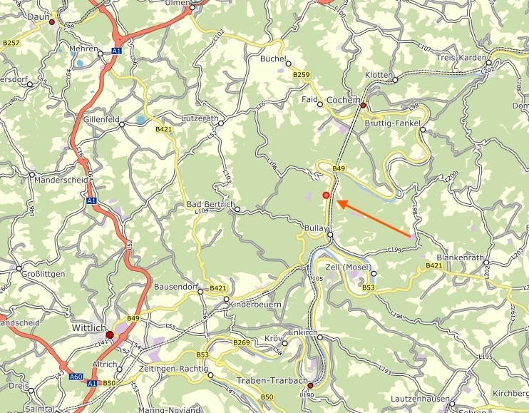 Zum Aufruf kommen drei nebeneinander liegende, hängige Flurstücke am Ortsrand von Sankt Aldegund im schönen Moseltal. Die Fläche ist ca. 50 Meter Luftlinie von der alten katholischen Kirche entfernt.