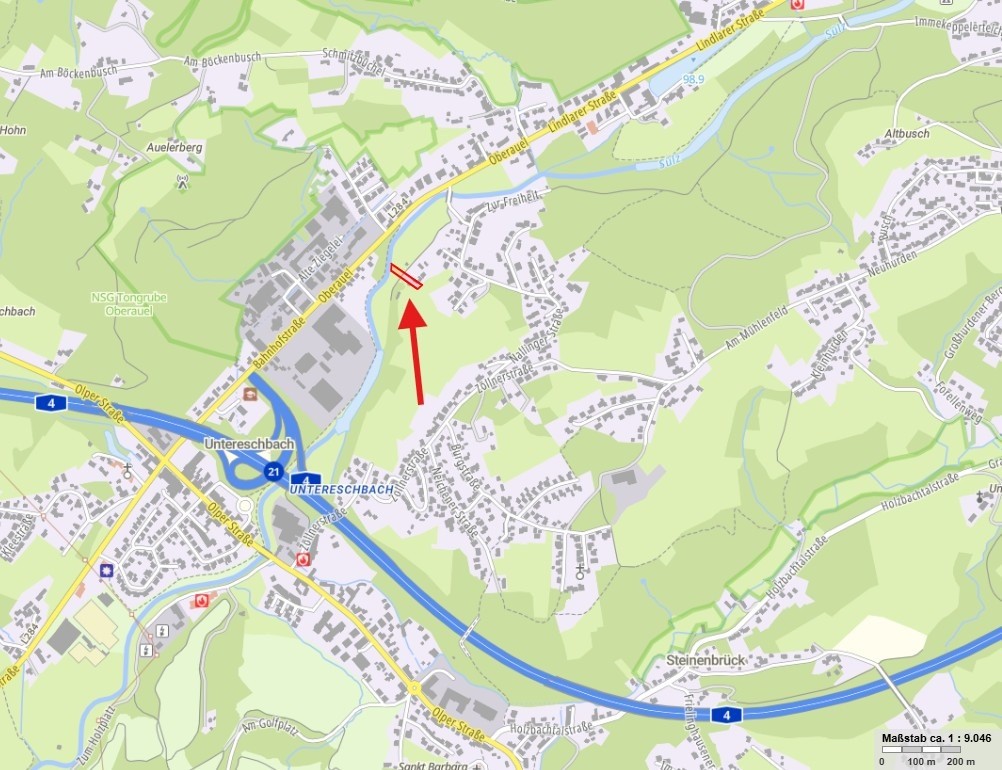 Zum Aufruf kommt ein schönes Flurstück direkt am Ufer der Sülz, erreichbar vom Ortsteil Untersteeg bei Overath. Von der Autobahnausfahrt Untereschbach sind es ca. 5 Minuten bis zu diesem Grundstück.