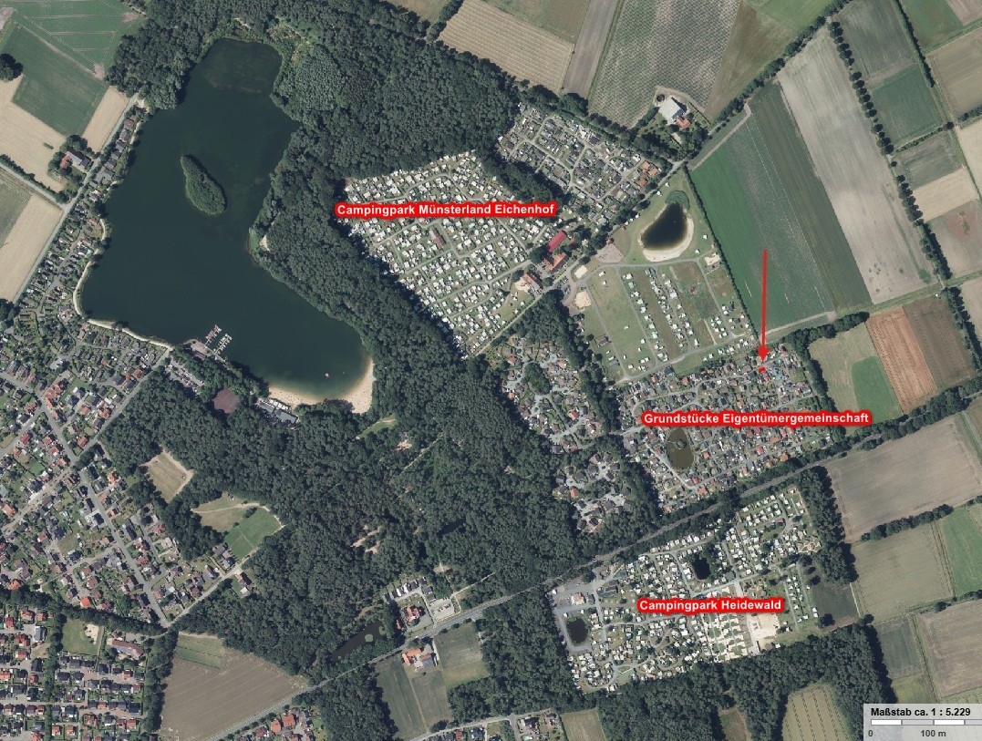 Das Versteigerungsobjekt ist somit im Prinzip ein gefangenes Grundstück auf dem Gelände einer Eigentümergemeinschaft zwischen dem Campingpark Münsterland Eichenhof und dem Campingpark Heidewald. Die Zufahrt zu dem weitläufigen Gelände der Eigentümergemeinschaft ist durch eine Schrankenanlage geregelt. Es obliegt dem Ersteher, die Zufahrtmöglichkeiten, vertragslose Nutzung und Zuwegung u. a. mit der Eigentümergemeinschaft zu klären. Auktionshaus und Verkäuferin übernehmen keine Garantien zum Sachverhalt.